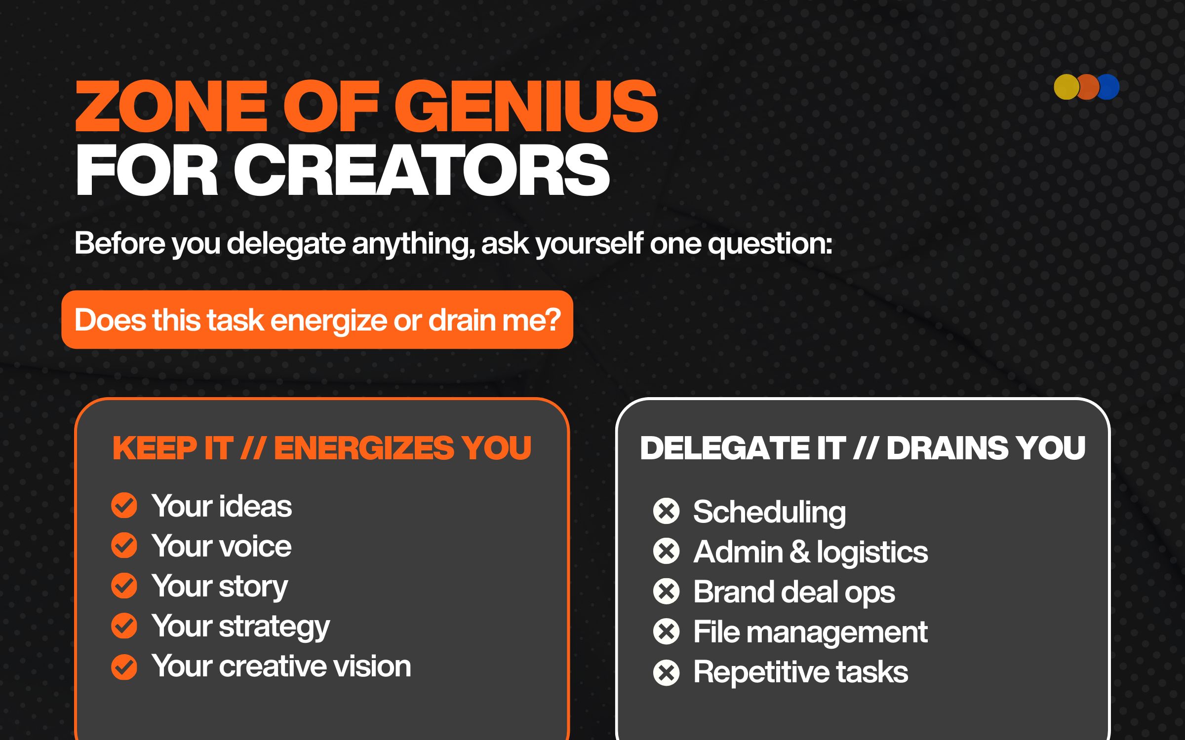 Before you delegate anything, ask: Does this task energize me or drain me? Early on, Varun outsourced his ideas and strategy — the stuff that made him him. The second time around, he kept the creative work and offloaded everything operational.