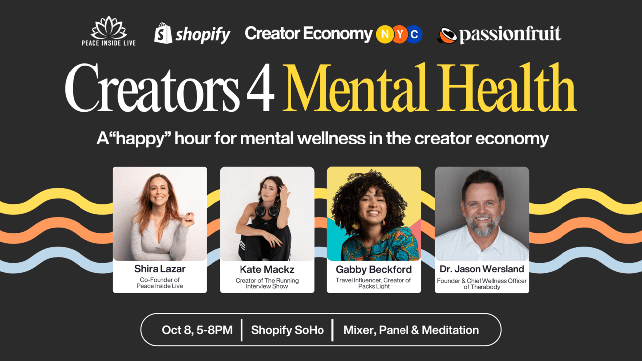 We're collaborating with Shopify and Peace Inside Live for a joy-filled happy hour featuring top creators, wellness products, and mental health experts, including a meditation session and a panel moderated by Emmy-nominated host Shira Lazar and featuring: